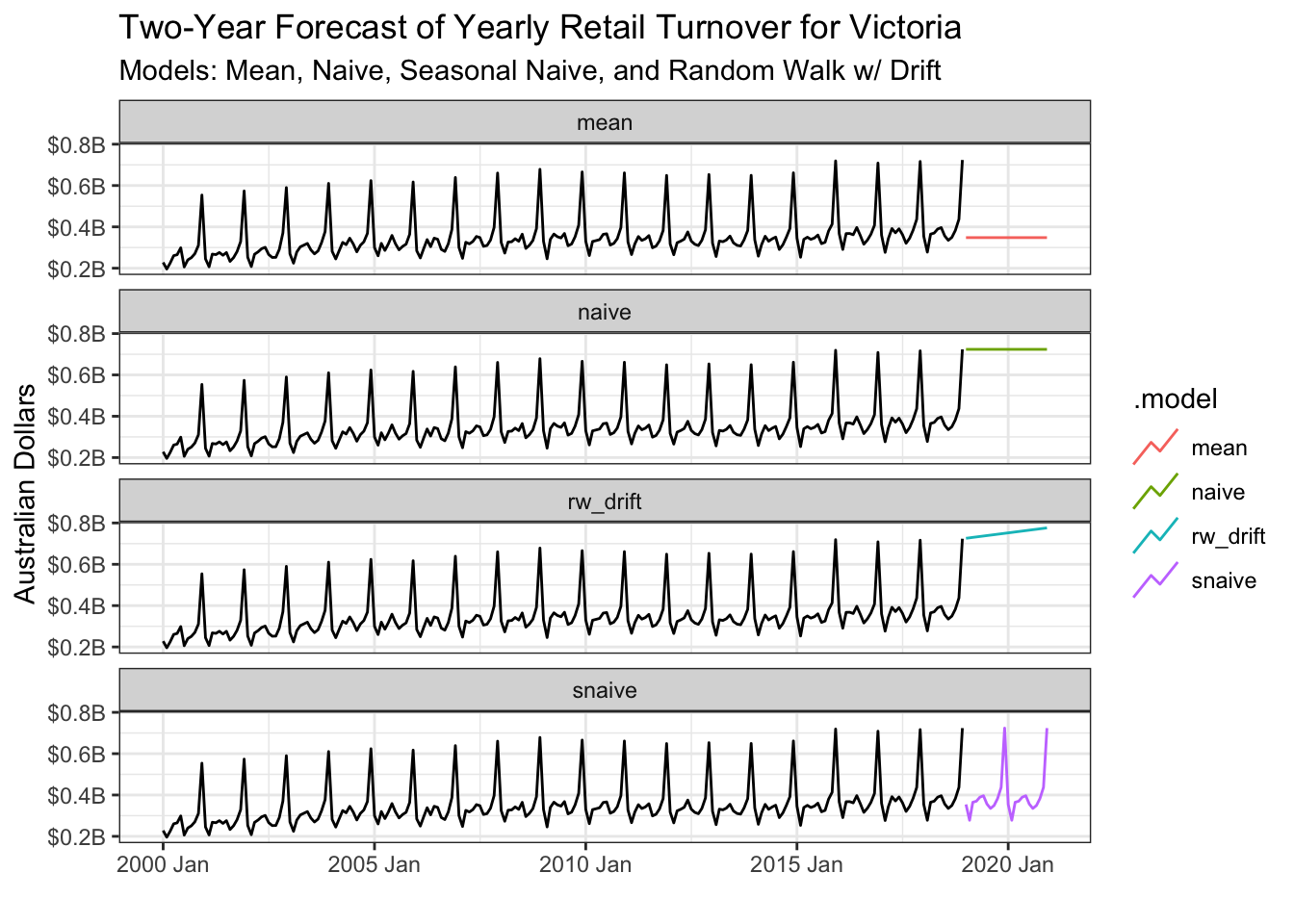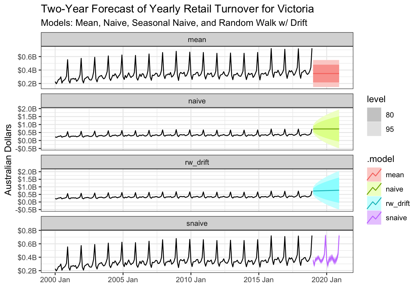 The fable package contains several “basic” methods of forecasting. These methods, at times, can prove quite useful, and can even produce good forecasts; however, they will most often be used as baselines to compare the performance of other, often more complicated, forecasting methods. These methods include: