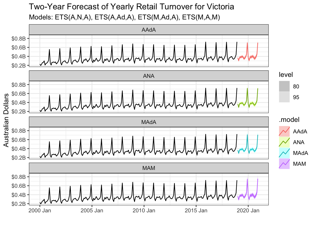 subtitle = "Models: ETS(A,N,A), ETS(A,Ad,A), ETS(M,Ad,A), ETS(M,A,M)",