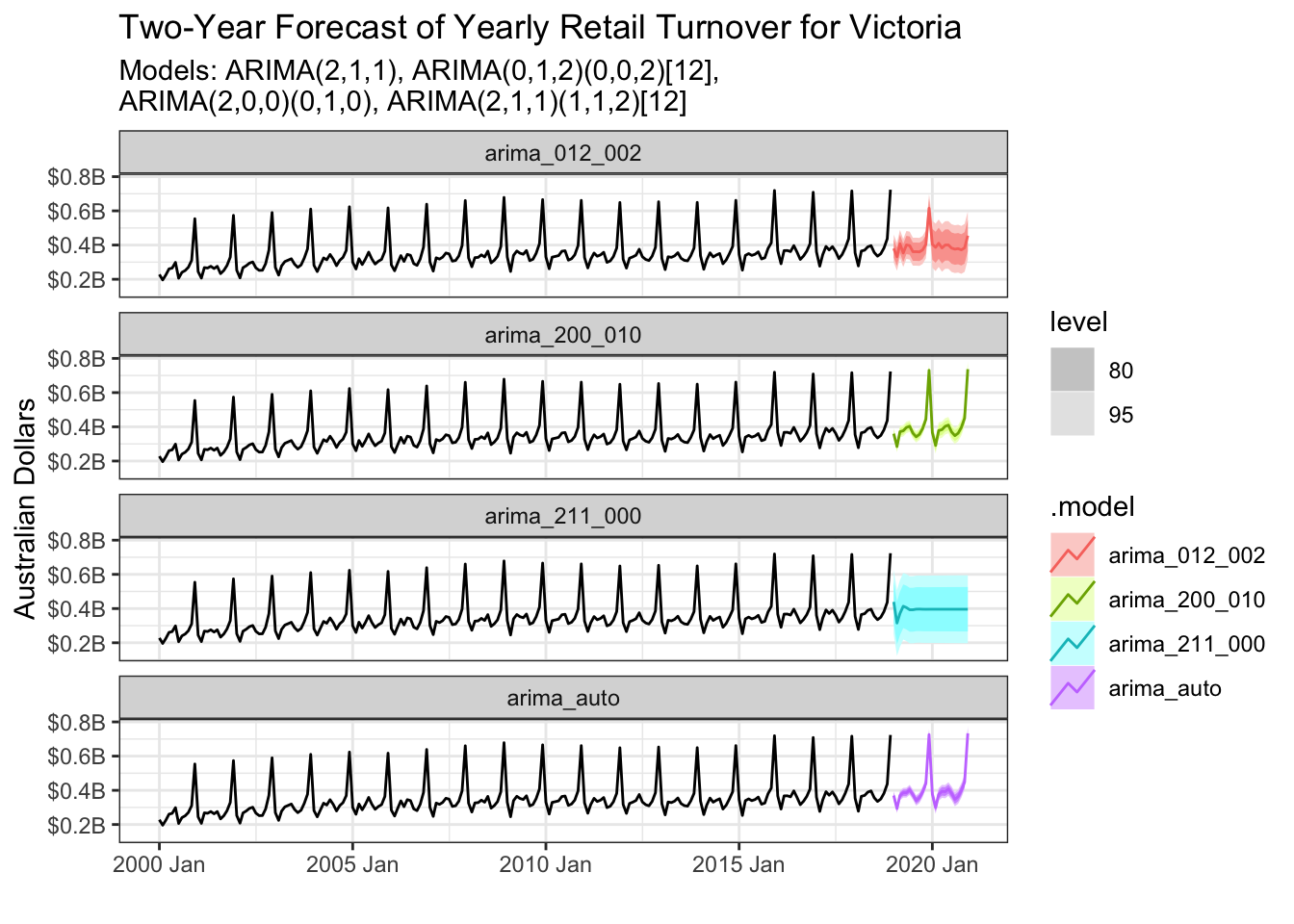subtitle = str_glue("Models: ARIMA(2,1,1), ARIMA(0,1,2)(0,0,2)[12],