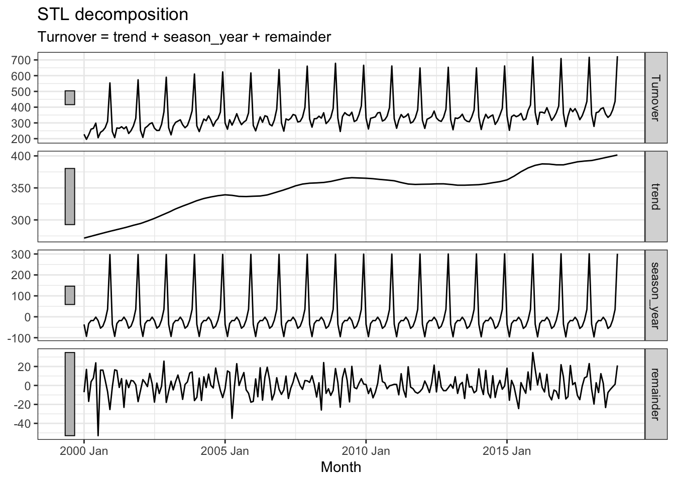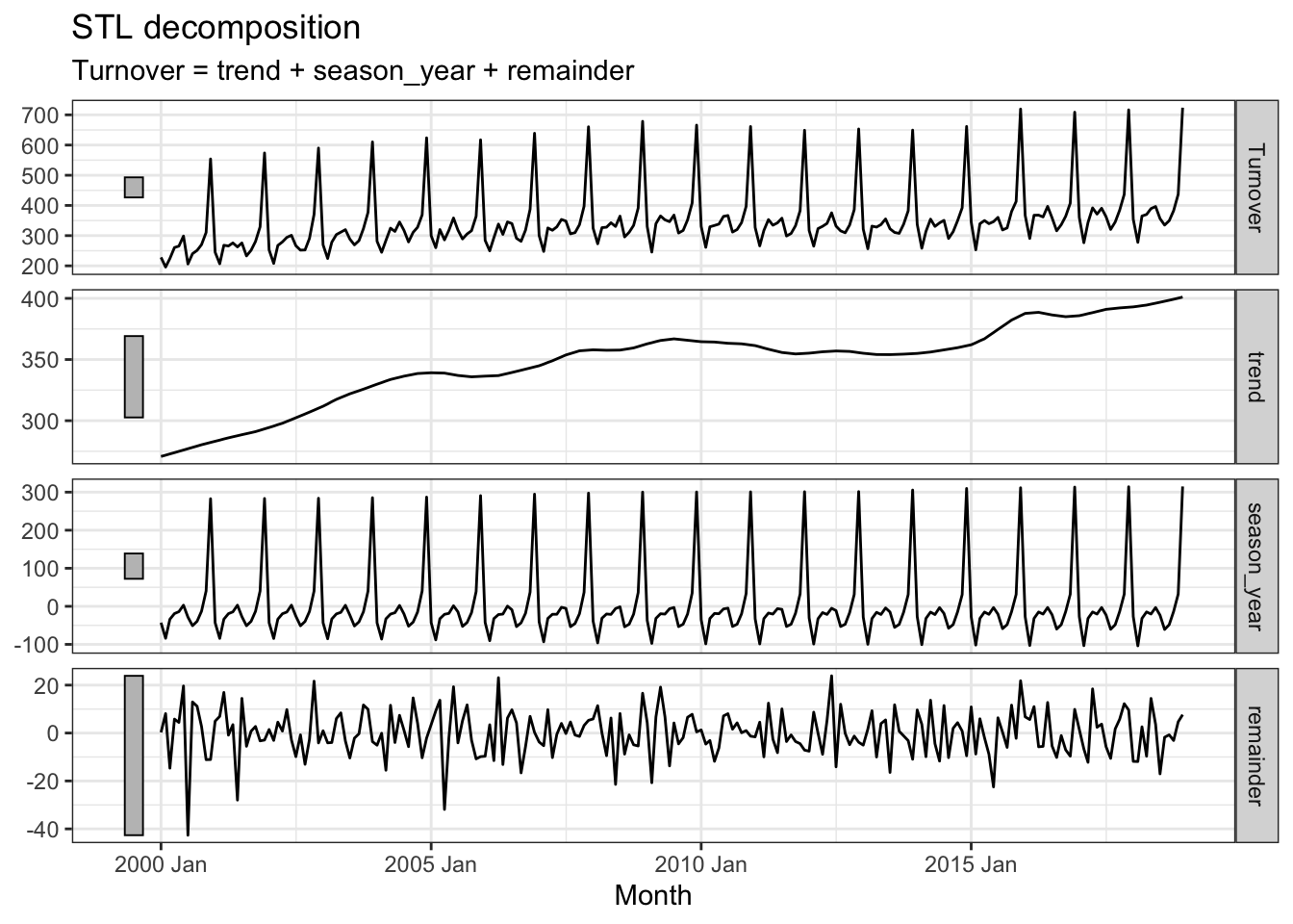 The feasts package provides the STL() function to easily decomposes a time-series. STL stands for Seasonal and Trend Decomposition using Loess.